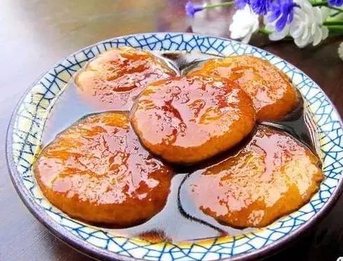 9,糖油粑粑渐渐变软了,着色了,油光发亮时就可以捞出了