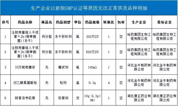 1.由于生产企业进行新版GMP认证,生产车间改造或未通过新版GMP认证等原因无法正常供货的,生产企业需书面明确GMP认证截止时间,认证后能否继续履约,由中心组织专家审定是否保留该品种中选资格。具体品种见附件1。共5个品种。