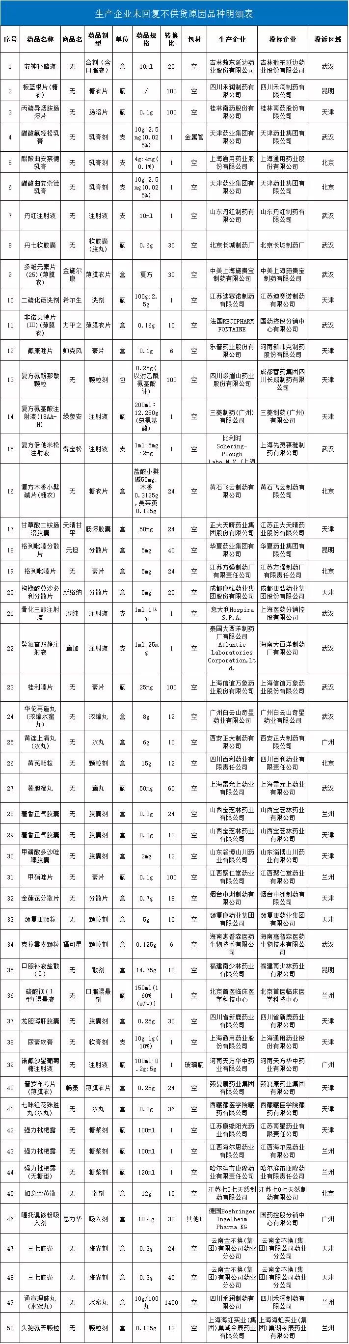 此外,目前仍有67家生产企业81个品规无任何反馈和响应,现将具体品种及涉及不供货区域告知(见附表2),请涉及相关品种的生产企业尽快与投诉单位沟通,并于2015年12月16日17:,同时邮寄原件。