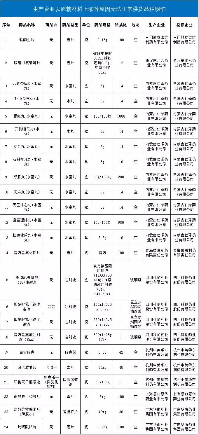 2.生产企业以原辅材料上涨、原材料短缺、代理商改变、公司整合、产品销量过低、产品工艺改变、生产设备维修等理由不履约,将取消该品种的中选资格并列入违约黑名单(该品种将不得在军队系统采购使用,该企业将在今后军队药品集中采购中扣减商业信誉分,下同)。具体品种见附件1。共24个品种。