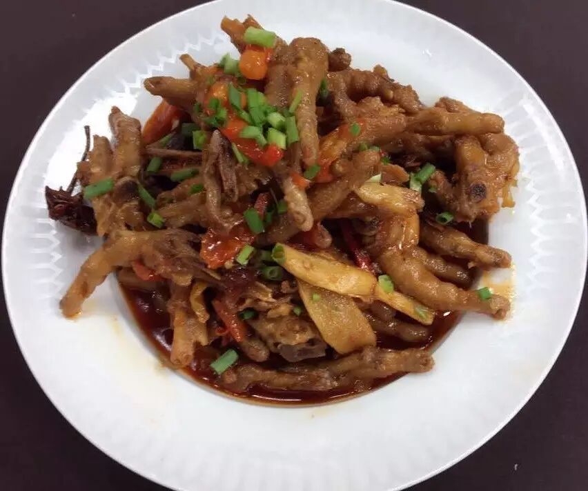 3、起油锅,下姜片爆香,加入鸡爪翻炒