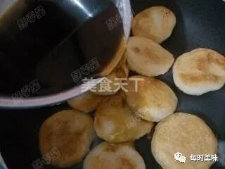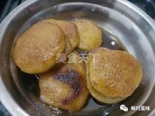 12、摇晃锅底,使糖汁均匀的与油混合成为糖油,并将粑粑翻转一至两次使两面都裹上糖汁,最后大火收汁至浓稠时关火