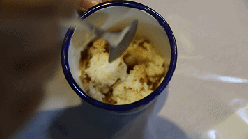 既然是拌饭,自然要拌开,左手抓紧杯手,右手拿起勺子,三下五除二,一杯正宗的儿时猪油拌饭就诞生啦,细细闻,还能闻到饭香呢。
