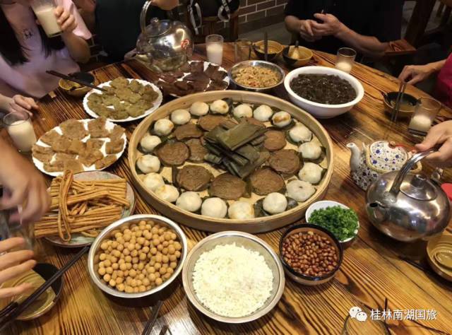 品尝阳朔地道的风味小吃-“粑粑宴”,感受来自仙境阳朔的美食!(柚子叶粑、船上粑、发糕粑、甜糕粑、咸糕粑、狗舌粑、萝卜粑、大肚粑、糖水粑、肉糕粑、芋头粑等),并且还有石墨豆浆、仙人豆腐、油茶、漓江粥等小吃。