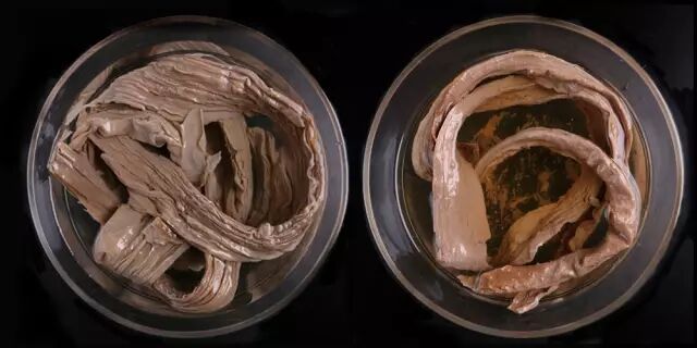 左边头层腐竹颜色浅, 右边尾竹颜色深营养差