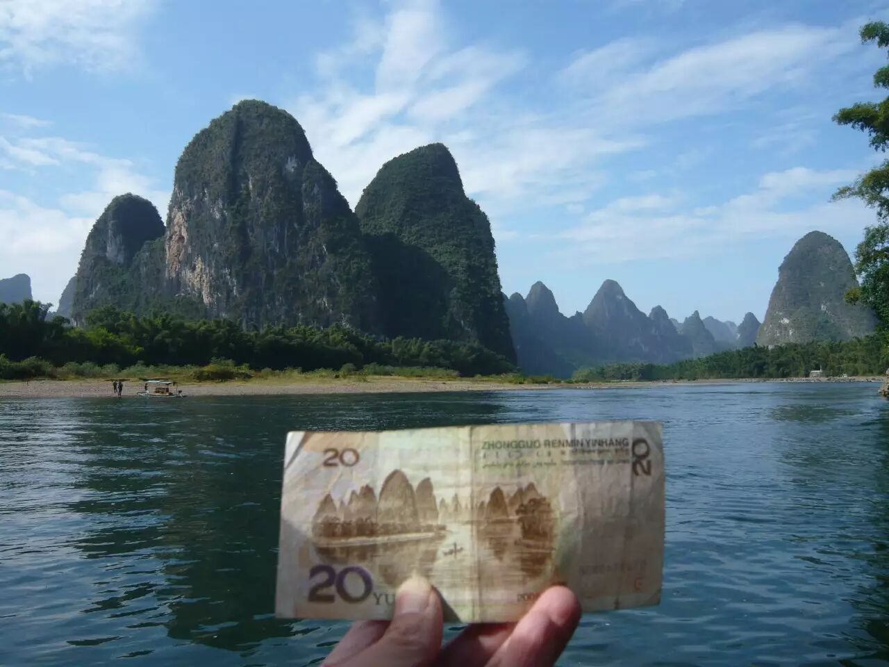 一叶扁舟,碧波荡漾,从杨堤上船,顺流而下,吹着细细的微风,一览漓江的山水风情。