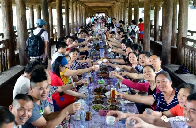 民族风雨桥吃民族百家宴。游客在长桌宴上品尝酸肉、凤鸡、腊肉、油茶、糯米酒等龙胜地方特色佳肴,体验民族风情饮食文化。