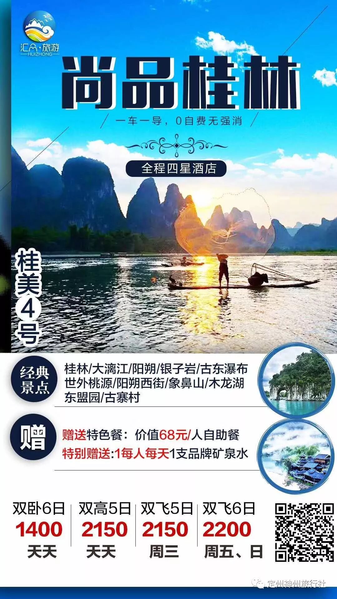 ※放心品质:该线路各种品质资源,合理搭配,科学安排,超高性价比。此外,特别赠送:①每人每天1支品牌矿泉水----感受桂林的清凉;