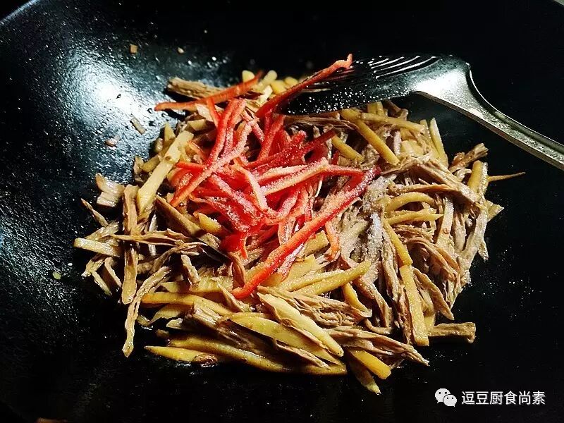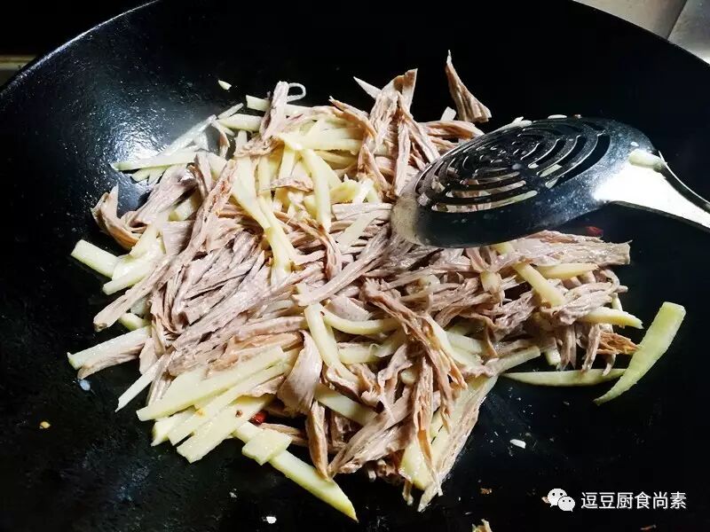 5.冬笋、腐竹同时入锅翻炒几下,倒入适量酱油炒熟。