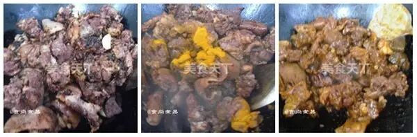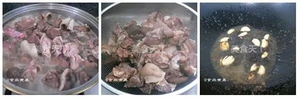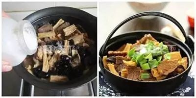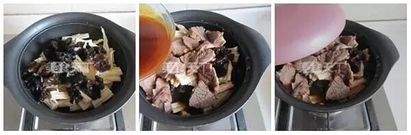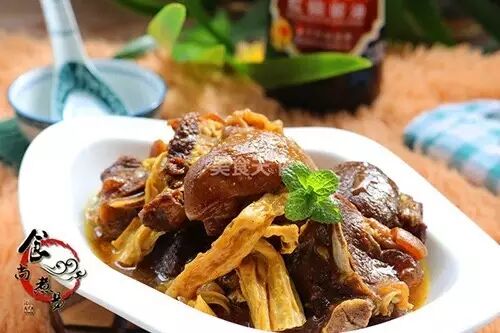 13、炒锅烧热,倒入羊肉煮沸,将浸泡软的腐竹捞起沥干水,放入羊肉中焖煮15分钟左右即可