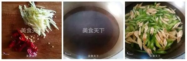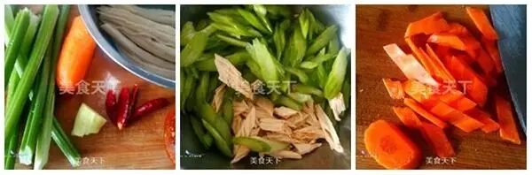 翠圃园芹菜200克、干腐竹25克、胡萝卜一段、生姜一块、自制麻辣红油适量、生抽适量、米醋少许、花椒油少许、油少许、干辣椒四个