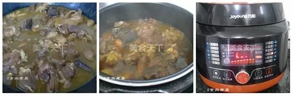 11、再盛入电压力锅内,遮盖通电,调成炖排骨键就可以了,因羊肉前期焯过水,爆炒过,不需炖太长时间,炖的时间过长会酥烂不成型。压15分钟就够