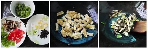 10、 将泡软的切成小块腐竹垫入锅底, 再加入黑木耳;