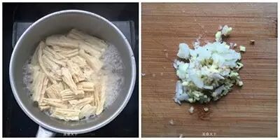 8、泡好的腐竹切段,入油锅中半煎炸至金黄捞出待用;