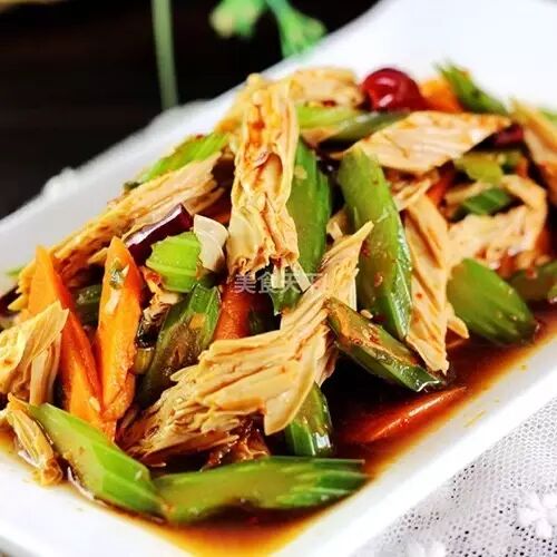 10、芹菜、腐竹、胡萝卜装入容器里,倒入做好的调料,拌匀即可。