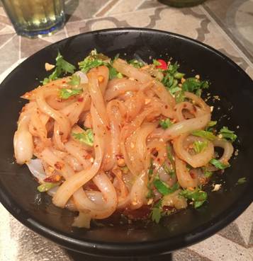 烤鱼上满满的红辣椒,一看就很有食欲,口感麻香,搭配上爱吃的配菜,宽粉、青笋、藕片、腐竹真是完美。餐前有赠送的凉菜,可以消磨等候时间。正菜上来,烤鱼的卖相不错,调味和火候也恰到好处,鱼上面还有一个肥猫的小旗帜。