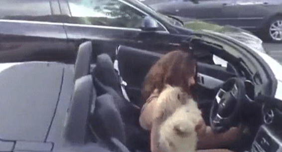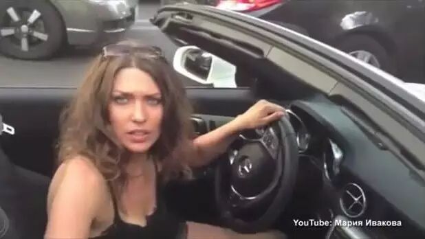在俄罗斯的某街头,一位富家女开了辆敞篷奔驰跑车,旁边的座位上是一只漂亮的狗狗~