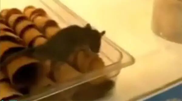 一只灰黑色的老鼠在摆放“脆皮蛋卷”的玻璃柜里来回爬行。 未来新闻网 视频截图