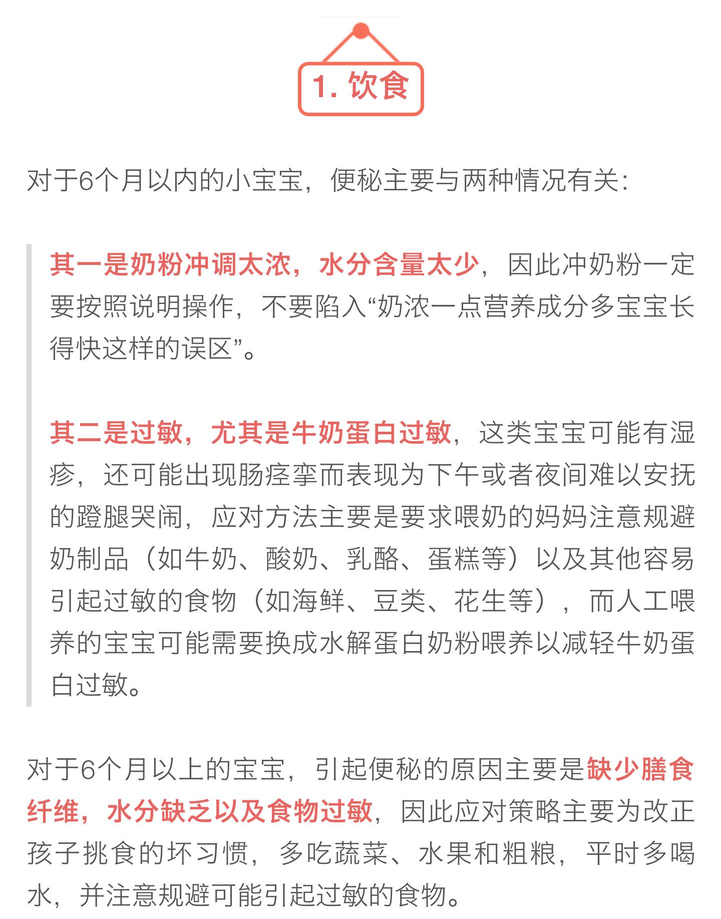 其一是合理饮食,即前面讲到的注意配方奶的配比,注意膳食纤维及水分的摄入,注意规避过敏食物;