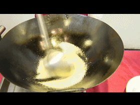 小火倒入白糖煸炒,炒化至金黄色。