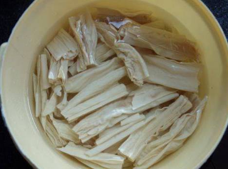 干的腐竹很轻,泡的时候总是会有一小部分浮在水面上,有些地方泡不到,泡的时候上面再盖个盘子,让腐竹全部泡在水中,这样能保证每一个地方都泡发。基本泡发后,切成细丝再在温水中泡二十分钟,泡出来的腐竹就相当完美了。