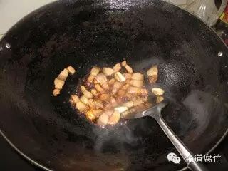 3、起油锅,爆香蒜头,将五花肉入锅煸炒一下。