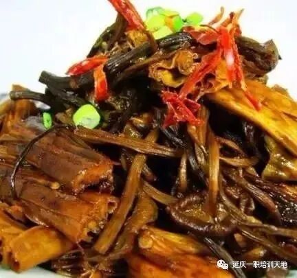 2.腐竹用温水泡半个小时后切段,控干水份,放入油中炸成金黄色捞出,再放进锅中飞水待用。