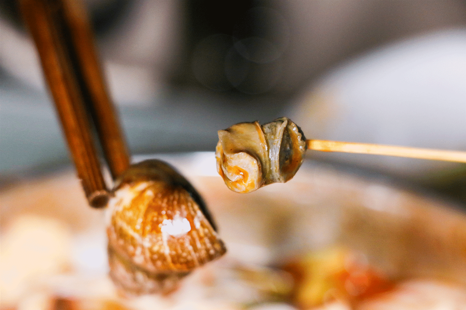 一手夹住螺蛳,一手用牙签戳出螺蛳肉~