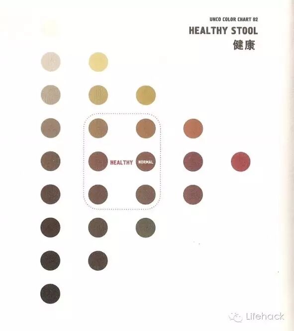 最健康的便便是下图中间位置的颜色。营养过多,颜色就会变深;反之,若是营养不良,颜色就会变浅。