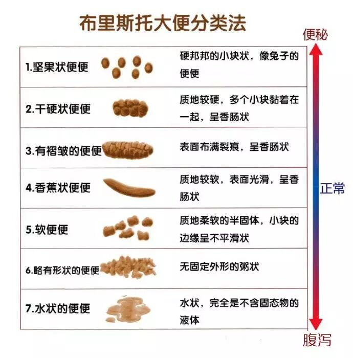 除了通过颜色辨别之外,形状也是重要的参考指标之一。其中最权威的要数“布里斯托大便分类法”,根据便便形状来判断身体的健康状况: