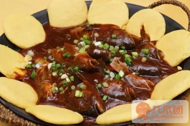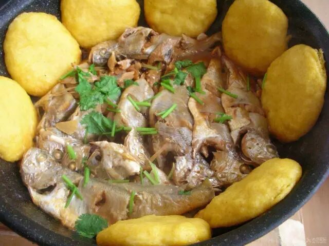 鱼锅粑粑,顾名思义,就是在焖鱼的铁锅里贴饼子。在荣成,这可称得上是有名的特色菜。虽然这道菜在不同地区有不同的叫法,有的叫鱼锅饼子,有的叫鱼锅粑粑,但做法却基本相同。在《舌尖上的中国》第二季第3集《时令》中,就有一道叫做“铁锅炖鱼贴饼子”的菜肴,它就是鱼锅粑粑,由此可见,这道菜流传甚广。其实,鱼锅饼子最早在胶东沿海一带出现,后来,随着大批山东人闯关东,这道菜被带到辽宁大连等地。在做鱼锅饼子时,焖的鱼一定要新鲜。有的只焖一种鱼,有的焖杂鱼。粑粑是在鱼焖好之前贴在锅壁上。这样一来,等到鱼焖好了,饼子也蒸熟了,而且粑粑还能熏染上鱼的香味,出锅以后越发黄腾腾、暄乎乎。