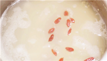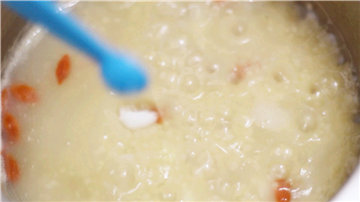 4. 小米已经在水开之后煮了5分钟,我们放入山药、枸杞,一起中火煮5分钟,再转小火煮约15分钟