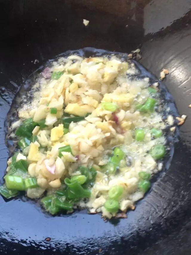 锅内放油,加入葱、姜、蒜