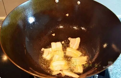 2、炒锅烧热加入花生油,放入五花肉片进行煸炒至出油,一定要达到干香的哦;