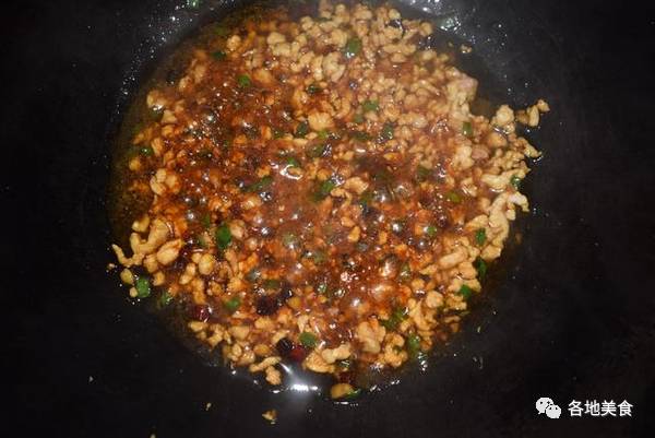 4,倒油,加入干辣椒和大蒜先爆炒出香味,然后放入肉沫一起炒,加入少量的生抽酱油和盐,起锅前撒入葱花。