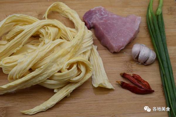 食材:新鲜腐竹300g,瘦肉100g,干辣椒3个,大蒜3掰,葱1棵,生抽酱油, 油,盐。