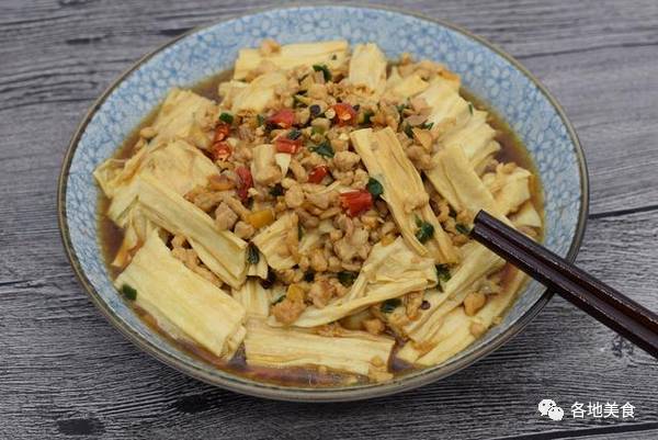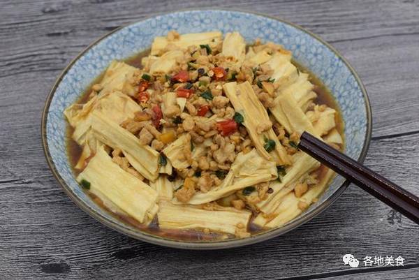 5,将肉沫汁淋在腐竹上面,用筷子搅拌均匀,一道拌腐竹家常菜就好了。饭里加入点汁,带着微辣的口感,吃上一口不仅开胃还非常的爽口。