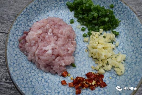 2,瘦肉剁碎,葱切成葱花,大蒜剁成末,辣椒切段。