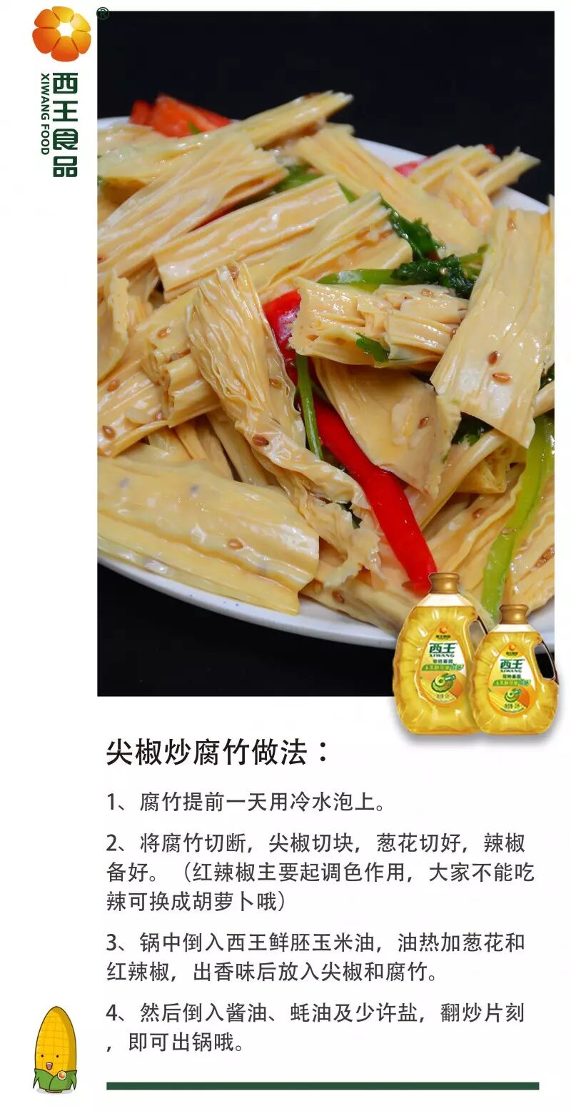 腐竹中含有的卵磷脂可除掉附在血管壁上的胆固醇,防止血管硬化,预防心血管疾病,保护心脏。搭配西王鲜胚玉米油中富含的维生素E,更为这顿营养餐加了不少分,使得这道尖椒炒腐竹成为了不少家庭的常见菜肴。怎么样,你学会了吗?