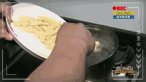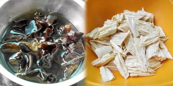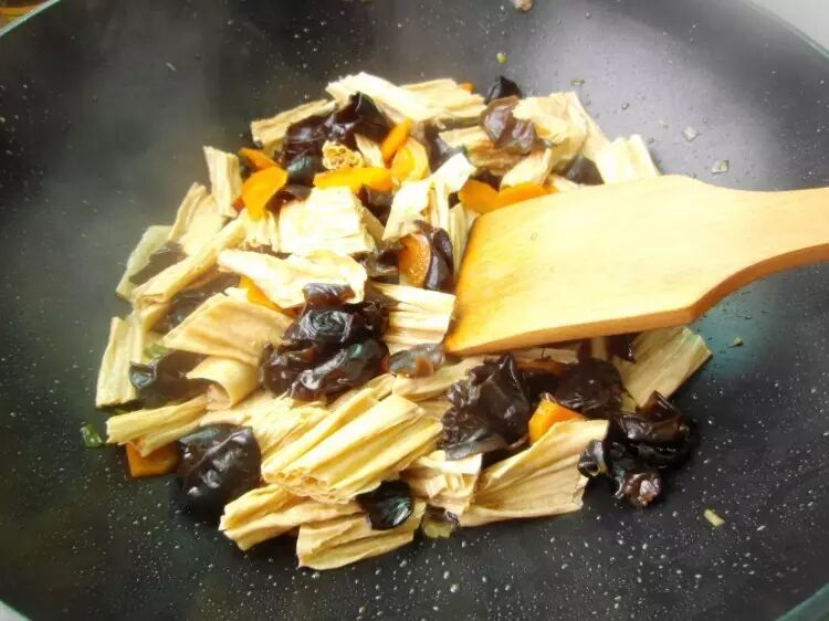 2. 热油锅,放葱姜辣椒炝锅爆香后放入腐竹、木耳炒匀;