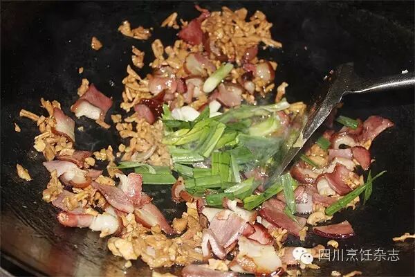 2.净锅放油烧热,先下腊肉片炒香,等倒入萝卜干稍炒几下才撒入蒜苗节,同炒至蒜香味浓郁时,即可起锅装盘(见图)。