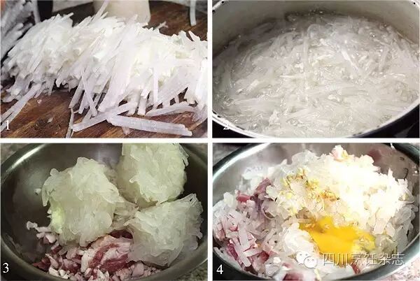 1.把白萝卜洗净,带皮切成粗丝后,投入沸水锅煮至软熟,捞出来放清水盆里漂凉;另把猪肥瘦肉切成小丁(见图1、图2)。