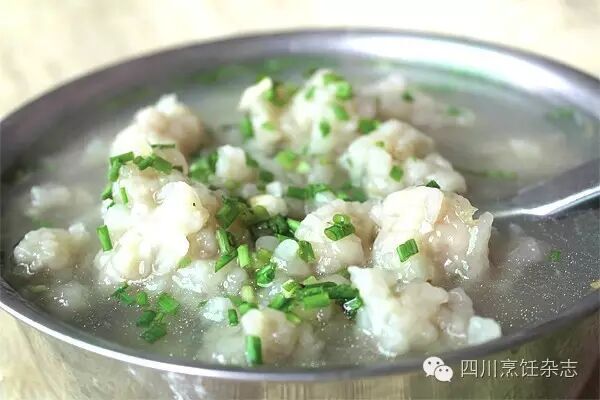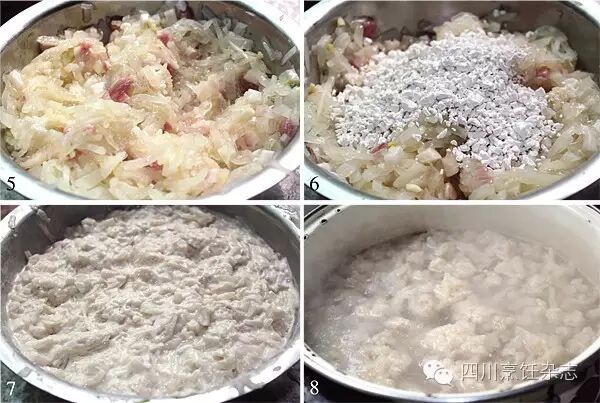 4.净锅上火,掺入清水烧至微沸时,把拌有红苕淀粉的萝卜丝抓成小坨状直接入锅,煮至熟再加盐、化猪油并撒入葱花,推匀便起锅装碗,即成(见图8~)。