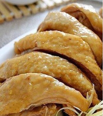 1.姜切丝,蒜切末备用;2.锅内倒入适量花生油、酱油、香油、盐;3.锅内的料调和均匀,把鸡肉放锅内使每块鸡肉上都沾上酱汁;4.盖上锅盖中火煮直到鸡肉熟;5.加入蒜米和姜丝,再焖煮2分钟,把鸡肉斩块,锅内酱汁倒在鸡肉上即可。