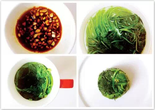 ③ 待菠菜冷却后,沥水捞出,挤干菠菜里的水份。取一个小的平底容器(杯子或小碗),将菠菜紧紧压入容器底部,将压紧的菠菜倒扣在盘子上。
