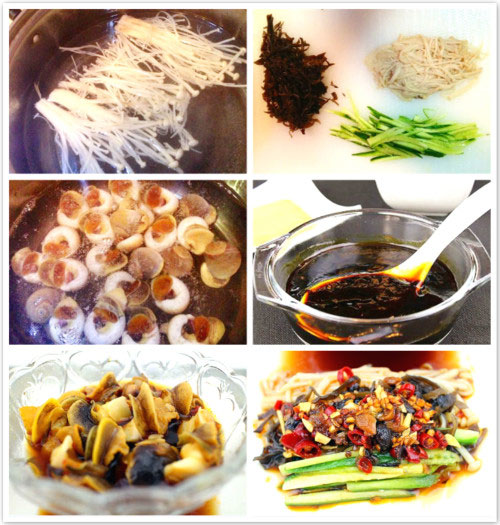 (金针菇、木耳、黄瓜切丝,丝切细些,捞汁菜件越细越能入味。)