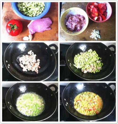 ④ 至毛豆熟烂,加入番茄丁,放盐,转大火,使番茄出汁,略煮,番茄熟烂出锅。