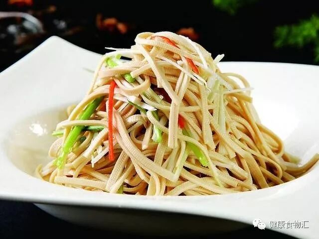 做法:将豆腐皮切成粗细均匀,约0.5厘米宽的丝。将切好的豆腐皮丝放入沸水中焯烫十几秒,变白即捞出。