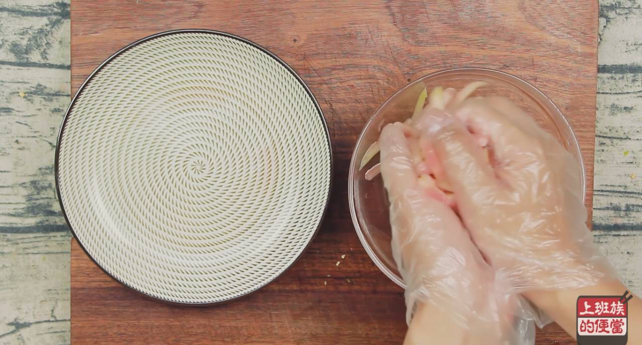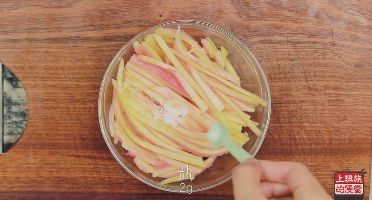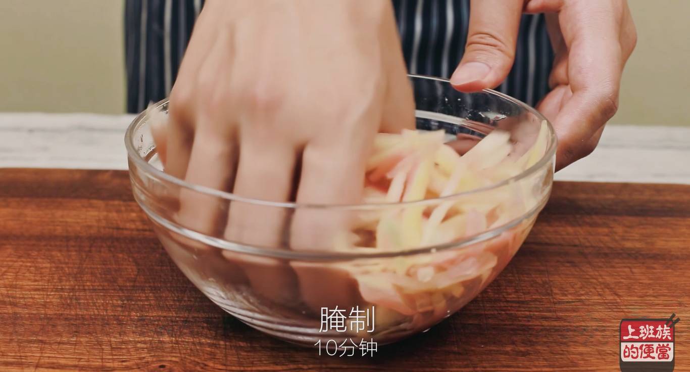 ▲将西瓜皮切成条,放入碗中,加半勺盐,用手抓匀,腌制10分钟;