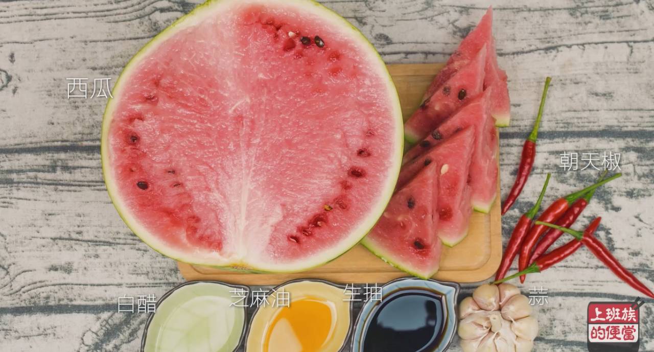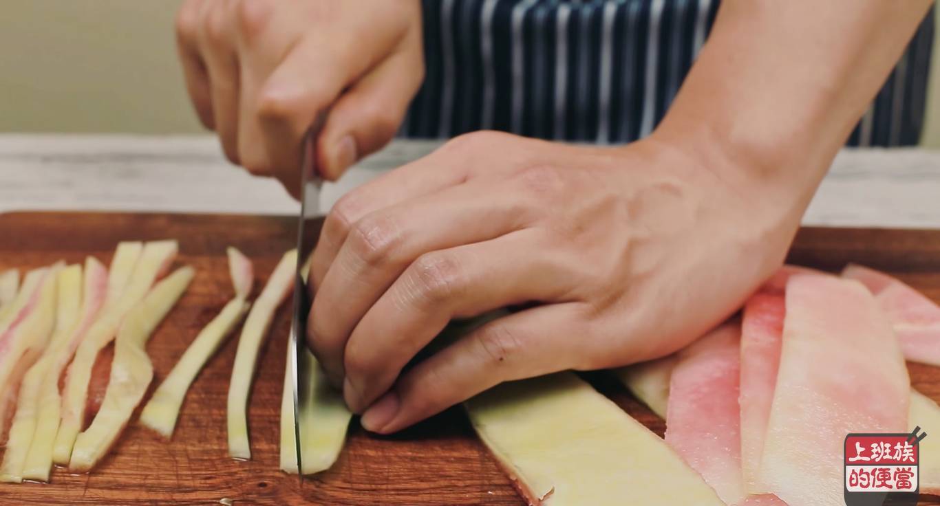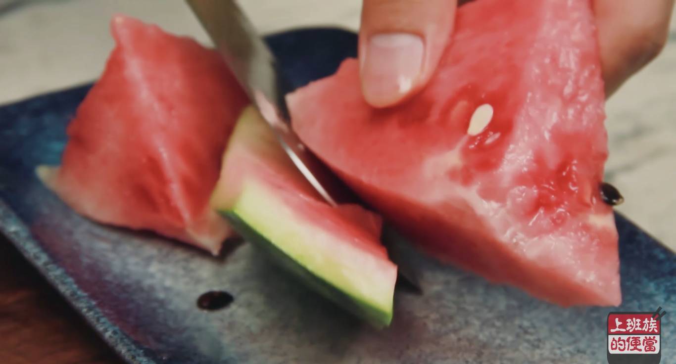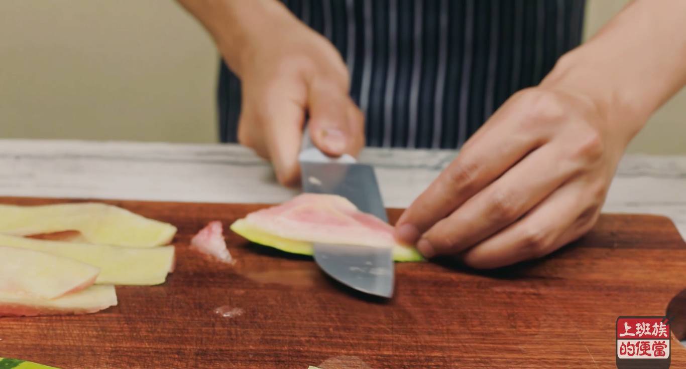 ▲将西瓜切块,剔出果肉,再剔出白色的部分,这些白色的果肉就是今天的主材料;